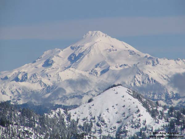 Well, I wouldn't normally post a report on this sort of trip, but this day was unexpectedly spectacular. . .<br><br>After slowly recovering from severe hay fever allergies the past few weeks, I really needed to get out and ski. I hadn't skied at all since winter's belated return in mid-March. Most of all, I needed to get some serious mileage on my new lightweight Volkl/Dynafit/Mega-Ride AT setup, to develop some trust and confidence in case I'm soon depending on them in a sketchy high-mountain situation. Time to hit the lifts and rack up the vertical. The forecast for Friday was gloomy, mostly cloudy, but better north than south. Even worse, Thursday's front had fizzled, NWAC telemetry at most sites showed only 1-2" of snow following moderate rain to 5000+ ft, with only Baker and Paradise getting the forecasted 5-6". So my expectations were very low. Based on the forecast, I decided on Stevens instead of Crystal. Stevens planned to reopen for Friday plus the weekend, and the price was right there too ($30 minus 25% Whistler Edge Card discount = $22.50).<br><br>Shockingly, Friday dawned clear and beautiful, and my spirits lifted. An easy drive brought me to Stevens just before the lifts opened at 9am, with the sun shining brilliantly and almost no one there. Conditions were dust on corduroy, 0-1" of powder on a solidly frozen groomed base following Thursday's rain and a hard freeze overnight. A few quick runs revealed that the Volkl-Dynafit combo does have the stiffness and torsional rigidity to carve 40mph GS turns on solid hardpack, not bad at all for an ultralight rig. But then someone on the lift mentioned how great the snow on 7th Heaven was. I didn't believe him, but I had to check--and found POWDER! 4-6" of medium-density powder up there atop a firm but uneven base. Wow, an unexpected bonus even though it was starting to get tracked out. After several quick laps, by 11am the bright sun was thickening the powder, and steeper groomed east-facing slopes down below had genuine corn on them. The afternoon was mostly spent yo-yoing the cruisers, beautiful sun-warmed packed powder which got spring-like by day's end but never slushy. Coverage is excellent on the groomed runs, variable off them. I thought the skis worked well throughout the broad spectrum of available snow conditions.<br><br>Anyway, it was my first time riding the lifts at Stevens since 2001, and it was surprisingly great, despite the ski area being barely 50% open and the previous day's rain/freeze. What a day, 57K vertical of excellent turns with no rocks struck, at a cost of only 50 cents per run. And a winning view too (see below). Everyone I spoke with on the lifts agreed that it was an unexpectedly fantastic day.<br><br>Summary of possibly useful info for planning backcountry trips to the North Cascades this weekend (before the next storm):<br>Surface conditions off the groomed:<br> 4000-5000 ft: dust on crust, 0-2" highly variable snow on firm rain crust from Thursday night<br> 5000-6000 ft: 2-6" medium-density powder atop firm crust, deepest on protected lee aspects (NE and east)<br>Weather: Very sunny all morning and midday Friday, with clouds building during the afternoon. So east and south aspects are likely to have a solid sun crust by Saturday, less on west aspects.<br><br><br><br>The south side of Glacier Peak fills the horizon from Cowboy Mtn (well, maybe a strong telephoto lens helps). <br>