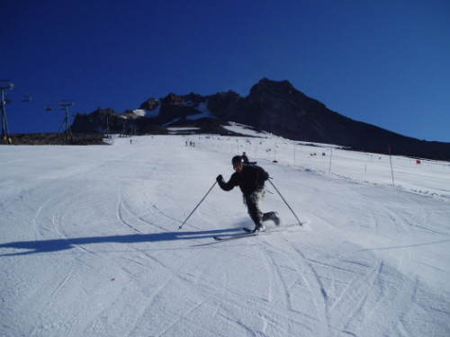 There's still plenty of snow left for anyone interested in paying for a lift ticket or hiking up to the Palmer snowfield. After thinking it over, we decided on getting lift tickets to ride as much as possible for most of the day with the possibliity of heading out to the Zigzag glacier in the afternoon. The snow was rock hard in the morning, but softened up nicely by about 9:30am. We never did get over to the Zigzag, but that may very well be where some September turns come from. A few people were climbing to the summit, but we didn't see anybody with skis decending from the Crater Rock area. The mountain pretty much cleared out by 12:00 and the last hour and a half we had it to ourselves. I saw a high school friend splitting up the Magic Mile and Palmer. Didn't recognize him at first, as I haven't seen him for 10 years and he said he lives in Utah. Kelly, not sure if you ever use this website, but it was good seein' ya