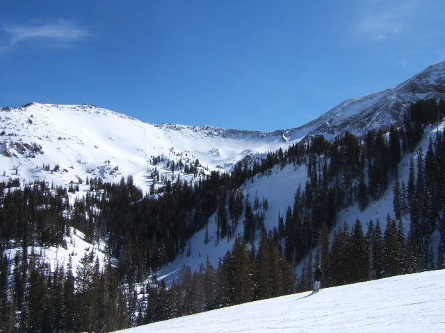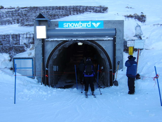 Although the coverage does seem “light”, it certainly is sufficient. Many of the lower glades and chutes are not adequately covered and there are rocks showing. I had forgotten how varied the terrain is at the “bird”. This year they installed a new high speed quad replacing the old Peruvian lift. This new quad goes higher and stops just below the ridge to Mineral Basin and is protected from the winds. It also provides access to a new tunnel which transports skiers with a “magic carpet” through the mountain and deposits you between the Mineral Basin and Baldy high speed quads. The conveyor belt only travels one way from Peruvian to Mineral Basin. The Cirque Traverse was open and some of the lines were a bit thin but others were OK.