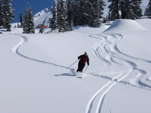 We decided to spend the evening at the nearby White River Snow Park with a great view of Mt. Hood. Friday was a sunny and brisk day. It was the last weekday at Mt. Hood Meadows, and we received a $10 discount by showing one of our season passes from another area. All of the quads, except Hood River Express, were operating. Conditions were packed powder on the upper slopes and corn on the lower slopes. I had forgotten how much terrain is available at Meadows. We cruised all over the mountain with excellent coverage. After lunch, we entered Heather Canyon through the A-Zone. WOW, perfect corn. Heather Canyon is gigantic and has so many steep lines that you could burn your quads within a few hours cycling the terrain. I can only imagine the frenzy on a powder day. By 2:30pm, we were ready to stop and start heading for White Pass and a backcountry tour. Meadows is currently operating only on weekends. It was a great spring powder adventure.