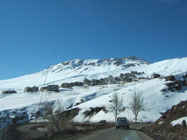 We spent the evening at Steven Hatcher and Wendy’s condo in a suburb NE of Santiago. A great bed and shower – WOW. Up early the next morning for the 55 km (30 mile) drive to La Parva which will take at least an hour. The road to Valle Nevado, El Colorado and La Parva is definitely a memorable driving experience. The road to La Parva has 40 hairpin turns and goes from 3,000’ to 9,000’. The road is one way going uphill from 8am until 2pm on weekends, two way from 2-4pm and one way downhill from 4-8pm. It’s a mad dash with a narrow road, tight hairpin turns and Gran Prix driving. Once at the base area we look down towards Santiago and you can see the air pollution layer – second worst city for air pollution in the Americas after Mexico City. I can believe it based upon Jill’s sore throat and watery eyes and Silas sniffling and wheezing. Being above tree line means snowy or flat light days are not particularly enjoyable skiing conditions. La Parva has lots of terrain to tour up and out, but the early morning firm conditions are not appealing. The top lift borders with Valle Nevado which is another large resort. It has been 2 plus weeks since new snow and things were a bit ‘worn’. We found the highest lifts accessed by pomas did not have anyone checking lift tickets which allows Silas to skin above the chairs and ride a few pomas for free. Adult lift tickets were $49 and Jill and I bought senior tickets for $35. The skiing is a mix of gullies, open slopes and steep pitches. A short boot track or skinning opens a world of steep terrain. We spent the morning cruising firm groomers and then spring corn as the day warmed. We left about 2:30pm to avoid the craziness of drivers descending and passing along the 40 hairpin turns. There are hotels and other types of accommodations on the mountain and their convenience has a price tag associated with them. Driving on a daily basis to the areas would certainly be tiring and a shuttle would avoid the craziness. If you have ever skied at one of the purpose built ski resorts in the French Alps you have an idea of what the resorts above Santiago look like.