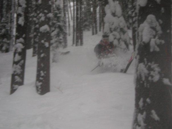 December 7th, more snow and it hasn't stopped since two nights prior! You might think one could get sick of all that pow, but oohhhh no, that's just crazy talk! We hit a lot of the same lines we did the previous day, but it was sooo much deeper than before! I couldn't believe it how great it was. There was this one line we hit at the top of Wild Card that was pow packed glades and you just zig and zag through trees all the way down and get hit with face shots the whole way! My quads killed me every time we got to the lift, but it was a good pain! We found some steep and deep stuff, but we had to duck under a rope to get there! we were under a lift that stopped right about an avalanche area. I should have known better to hit it, but we did it anyways and raced the slabs down it's 60 degree pitched face. I felt bad later when we saw ski patrol looking in the woods and following our tracks, if they followed them all the way down, they found out that we were ok! Shhh, don't tell anyone! Soon after, we found the best line we've ever hit in these woods that had chest deep pow and long glade runs that looked like they'd been cut just for us! That was heaven, if I die and go upstairs, I want it to be that run over and over again with fresh pow overtime! That night we saw Social D. and the Pogues and then went out for some drinks with some people we met the night before.