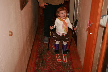Just got my daughter (20mo.) geared up, she's only done a few runs down the hallway but I'm sure she's good for at least 100yrds. waiting for that blue bird, sparkly snow day. Thanks for the skis Offpiste,