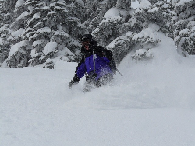 Jill and I had another wonderful powder day at Crystal. The day began partly cloudy and no wind, then became sunny and no wind and finished with heavy snow showers and no wind. We skied untracked lines until our quads requested a break at 2:30. We finally stopped to take a couple of photos which says it all. Chris, I can reduce to thumbnails if you plan to post any photos.