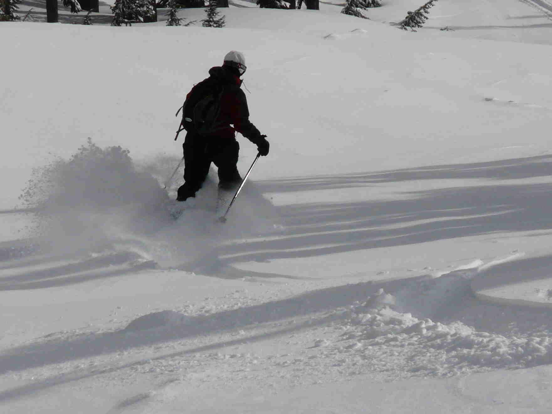 It all started Monday evening, April 21, while parked in the Alpine Meadows parking lot. I was checking the weather forecast along the west coast and noticed this large blob on the radar screen just west of Oregon. After focusing on the weather forecast for the direction of the blob, I started to get excited and asked Jill to look at the forecast. The Oregon Cascades from Mt. Hood to Mt. Bachelor was forecasted to receive a snow storm with freezing levels under 3000' for Tuesday through early Friday. I looked in the parking lot and it was bare and dry just like it was last month. We haven't seen a snowflake in 6 weeks and have enjoyed spring conditions in the Sierra. But all the powder trip reports from TAY and all those images finally overcame us. Jill just smiled and said "yeah, I'm ready for some cloudy skies and powder". Being the caring person many of you know I am, I did the "right thing". We left Tahoe Tuesday at 7am, and at Sunriver, OR we drove the backroad up to Mt. Bachelor, arriving 9 1/2 hours after leaving Lake Tahoe. After 5 miles the road became snow covered and there were only 2 sets of tire tracks on the roadway with 6" deep snow. Oh boy, I might have to put the chains on. What a nice problem to have. As we pulled into the Bachelor parking lot, the snowbanks were 15-20 feet high. It was snowing and there was 6" of light powder in the lot. We were like kids in a candy store. We parked about 20 feet from the Sunrise lodge in the camper and fell asleep to the winds howling and snow falling.