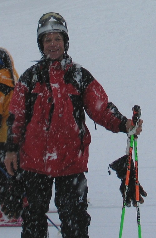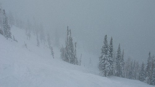 Early the snow was wet but plenty of it. (Not enough though to flatten out the bumps underneath.) Latter there were grapple storms and then latter in the afternoon the snow became small flakes and improved in quality. Visibility was fair but much better than yesterday.