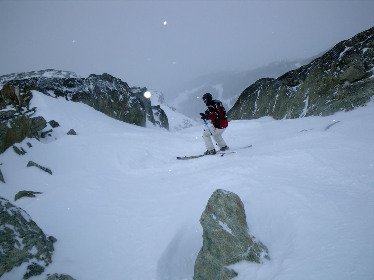 My son and I spent the day in incredibly light powder yesterday. Unfortunately, the coverage is still not great; I put a number of scratches on the bases of my new Rapid Transits . It snowed lightly all day and the visibility was decent. The nasty wind was only felt on the ridges and it deposited fine snow into the creases between the exposed rocks. I did get some face shots, but they probably would have been disqualified because they were wind assisted. The double-blacks that we investigated were closed; we did have fun in some of the chutes around Secret Bowl, as the photos below may suggest. We explored the upper mountain and skied a variety of runs and terrain. We could have skied to the car but I was concerned about doing further damage to my skis.