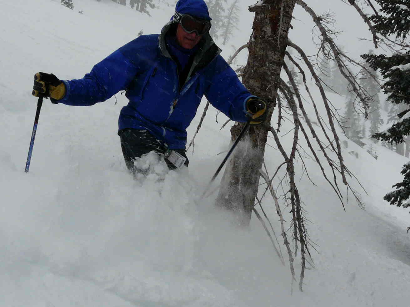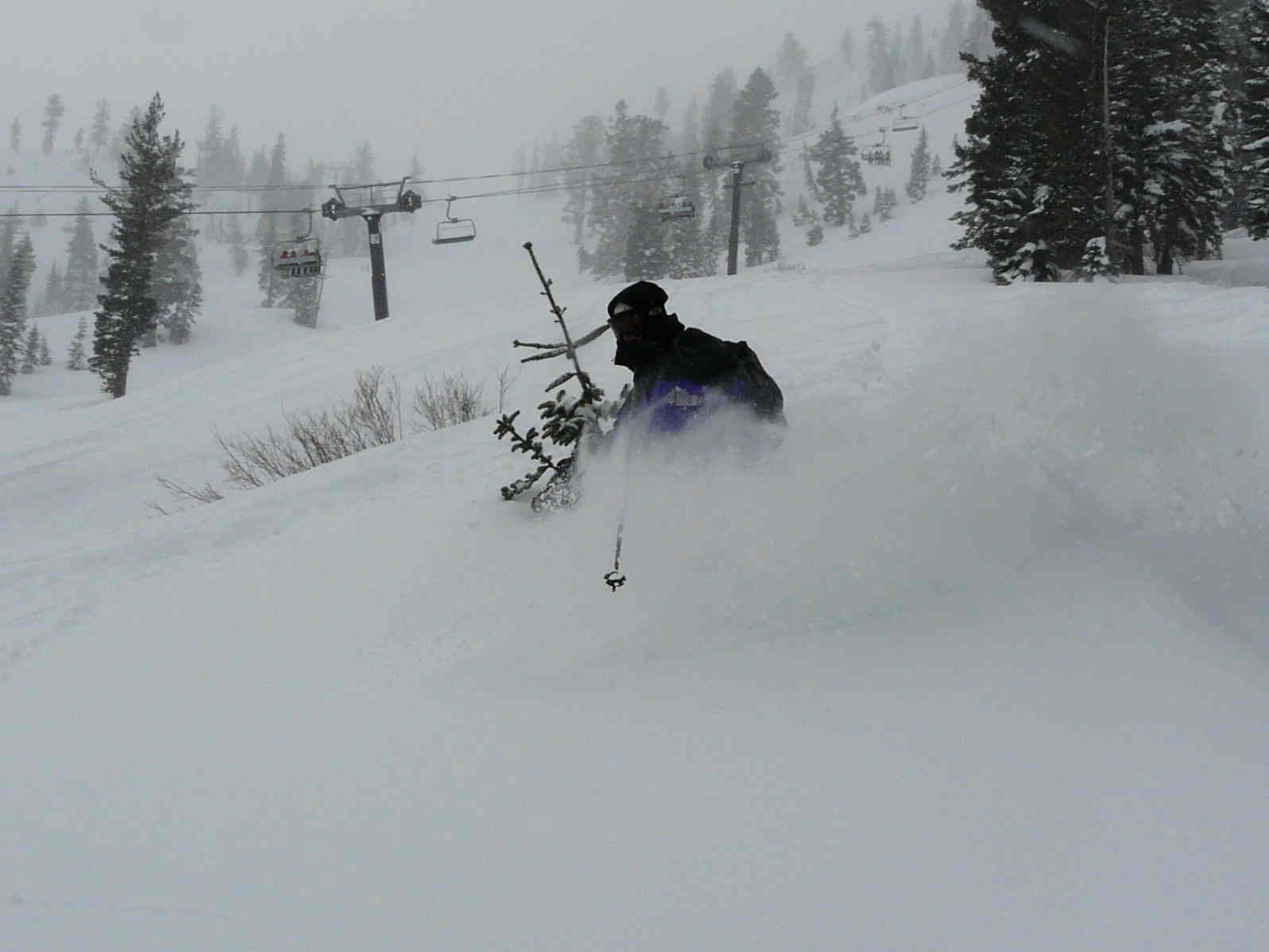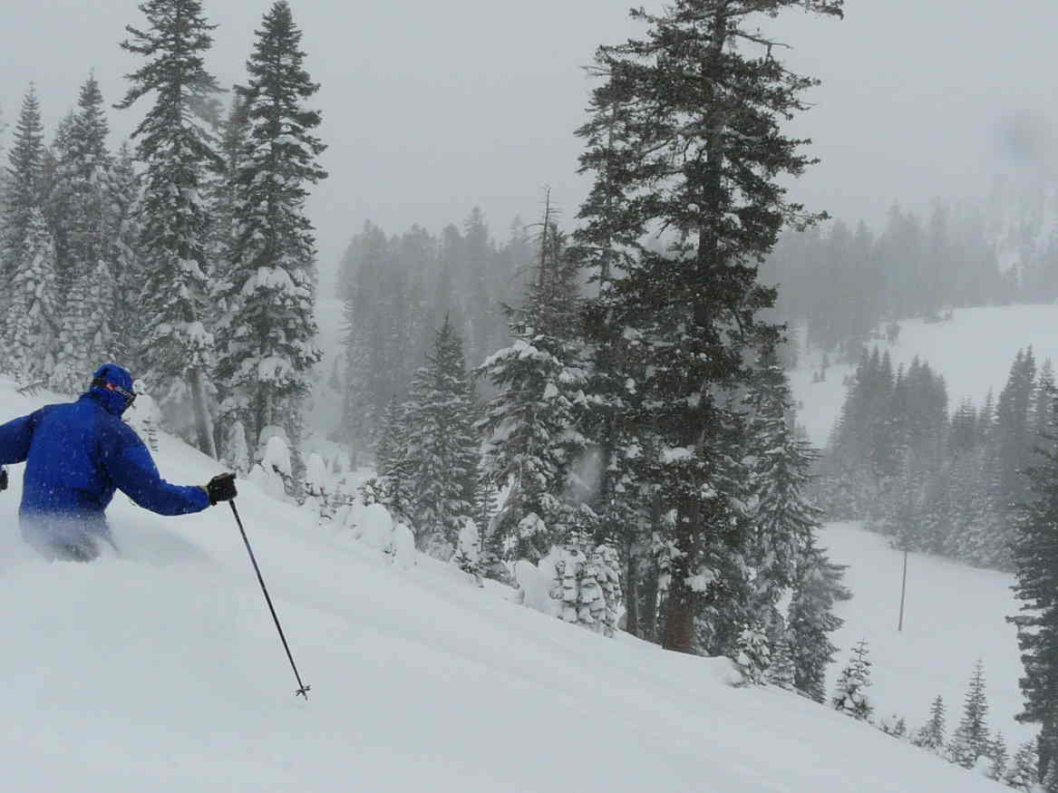 The report for Homewood was 6” at the base and 12” up top in past 24 hours. We pulled into the parking lot and Jill could see tracks from yesterday. She said “No way am I skiing that stuff on a powder day”. WOW, Grandma Jill at 64 is a powder diva. Ok, ok, ok. The report for Alpine Meadows was 15” at the base and 20” on top in the past 24 hours. So we turned around and drove to Alpine, with chains on, and found a deserted parking lot at 8:15. A quick breakfast in the van and we were at the 6 pack for the first wave.
