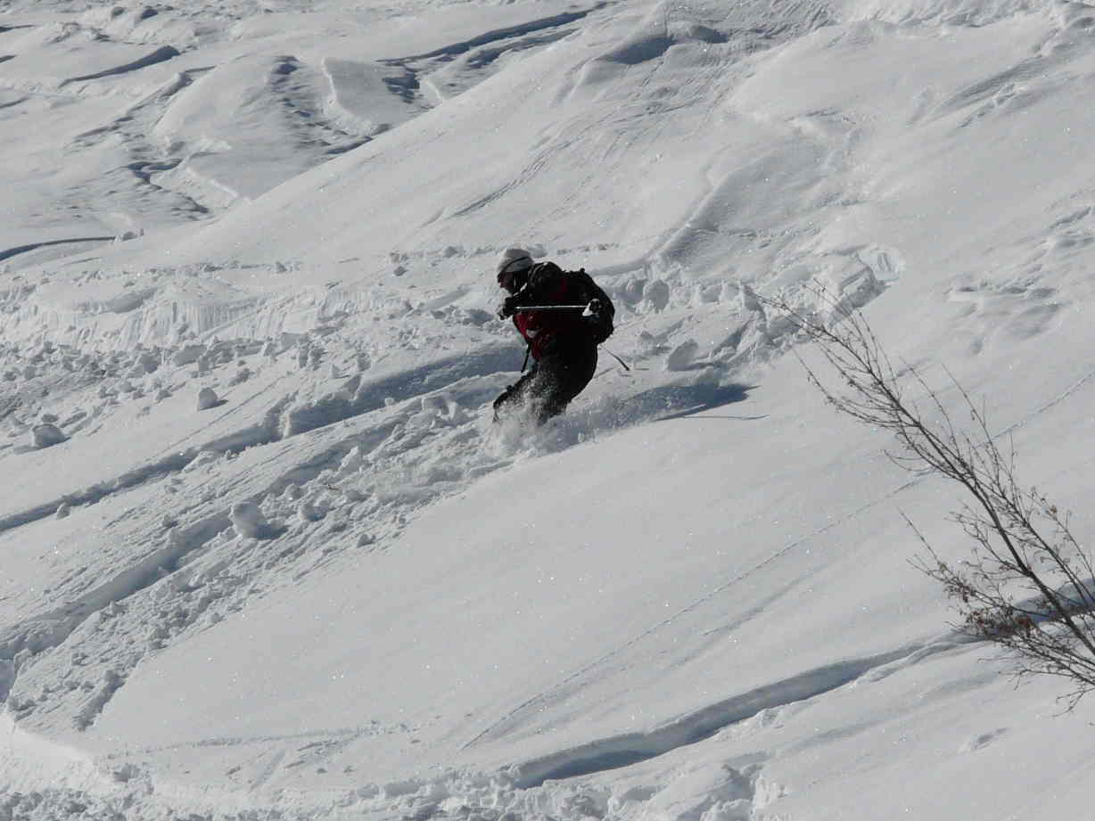 We were riding a chair with Michelle, a young ski patroller. I asked about Quail Face which has some excellent steep terrain but is often closed. She mentioned that it had been closed during the last dump and that the Warren Miller film crew was filming there yesterday. But she had just opened (and skied!) it after removing their jump, and said there was about 2 feet of great powder in the area. Needless to say, Jill and I bolted off the chair and skated and climbed out towards the access point for Quail.