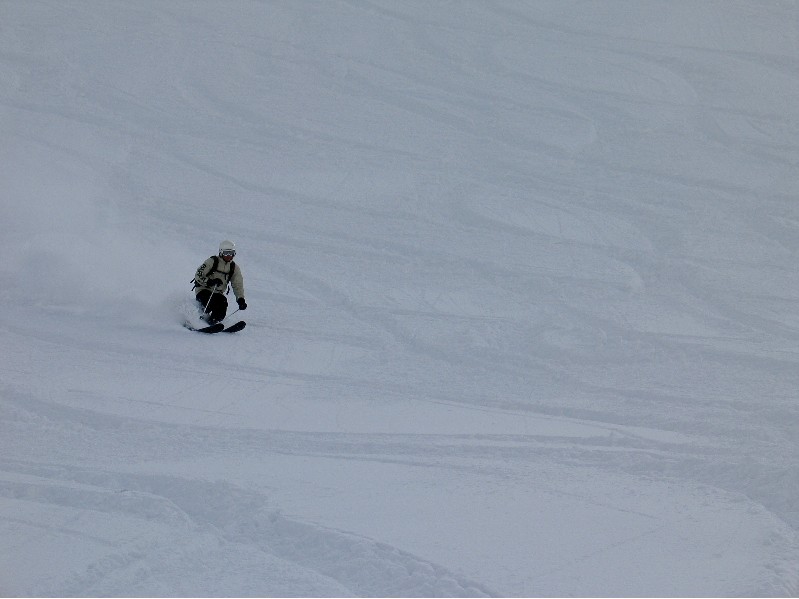 The mountain was covered with sugary snow that would fall through the fingers if you tried to pick up a handful. It snowed all day long and temperatures lowered as the day progressed. The snow retained the same wonderful consistency throughout the whole day. Thigh high powder was the norm.