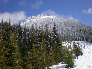Great Day, lots of peek a boo sun, groomers were buttery, left overs from yesterday had consolidated a bit but still joyful . North facing aspects were back in vogue. Best of the day was Elk Bowl from the top and the upper entrance, skiers high left of Rinky Dink.. Tracy, Kieth and the Sturdevent's crew were busy showing off next years gear and shooting video. Short North opened at 11, lots of deep (it's been mostly closed since Sunday, brief open Monday PM) unfortunately a lot of heaviness. Did a quick boot to the chair terminal and found bits of joy in the trees but not enough joy to do it twice. Took a quick skin up East Peak mid afternoon and was able to grab a few shots of Rock Face and Right and Left Angle Trees to O Meadows which may serve to clarify what's really back there. Based on the forecasts and todays soft snow I'd say the powder fest has come to an end for lift serviced skiing, however the prognosis for a long self propelled season is bright. I remain a dirt bag in B lot. That is all. (for now)