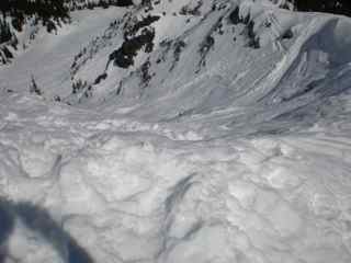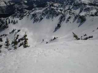 Another glorious day at Crystal, only problem, the chairs were not running and the parking lots were pretty near empty. Only folks there were clean up staff. None the less a great day for a walkabout up to the King. Skin in to Silver Basin was serene to say the least. The groomed track to the Party Knoll keg site was superb, from there on things got a wee bit mankey. My initial plan was to ascend lookers left of Three Way, then track around the Southern-Westerly exposure. Some kind soul had layed a Z track in yesterday which I'd eyeballed from the King. When I arrived at the knoll around 10am sun slough was in full swing with numerous releases on all of the usual Three Way slide paths and a couple moderate slides below Box Car Cornices. I wound up trying to avoid the slides and up tracked across lower Three Way, then booted up the saddle lookers right. While in the mist of the boot ( too soft and steep to skin ) a major chunk slid off Box Cars. The skin to the King was sweaty but non eventful. Top of the King was remarkably free of litter, no empty PBRs or bubbly bottles. Kudos to all those that packed it in and out yesterday. No brainier descent was Brain Damage, nice and firm and relatively free of slide debris. Was little spooky traveling alone and realizing Patrol was not right around the corner. All in all a great way to wrap the season.