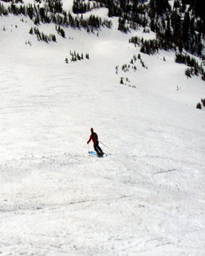 Headed back to the summit at 10:30 and poked around and determined that any snow that was in direct sunlight was nice and creamy. You had to traverse across what probably the worst snow I've skied in 27 days this season-frozen ice cubes with these weird shark tooth-shaped chunks of clear ice that were sometimes loose, sometimes attached. The most interesting part was when you hit this stuff and broke it free, it made this musical clinking noise (or maybe that was my teeth getting rattled!). But it still sucked. However, I got to hit what is one of my favorite runs anywhere-Cow's Face. 1500 feet of sweet corn snow with wide open above timberline skiing. The closest thing to flying in my book-super fast sweeping turns wherever the whim took you. Did a run in the cirque but the traverse was so awful that I bailed and went back to Cow's Face. Left at 12:30 sad that the season was over but I have great memories to get me through to November. And it was an injury free season! Hope to do Bachelor again in May 2010!