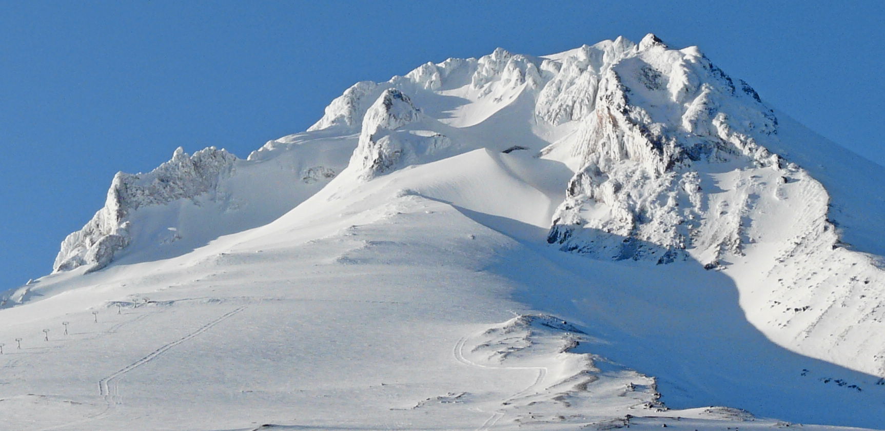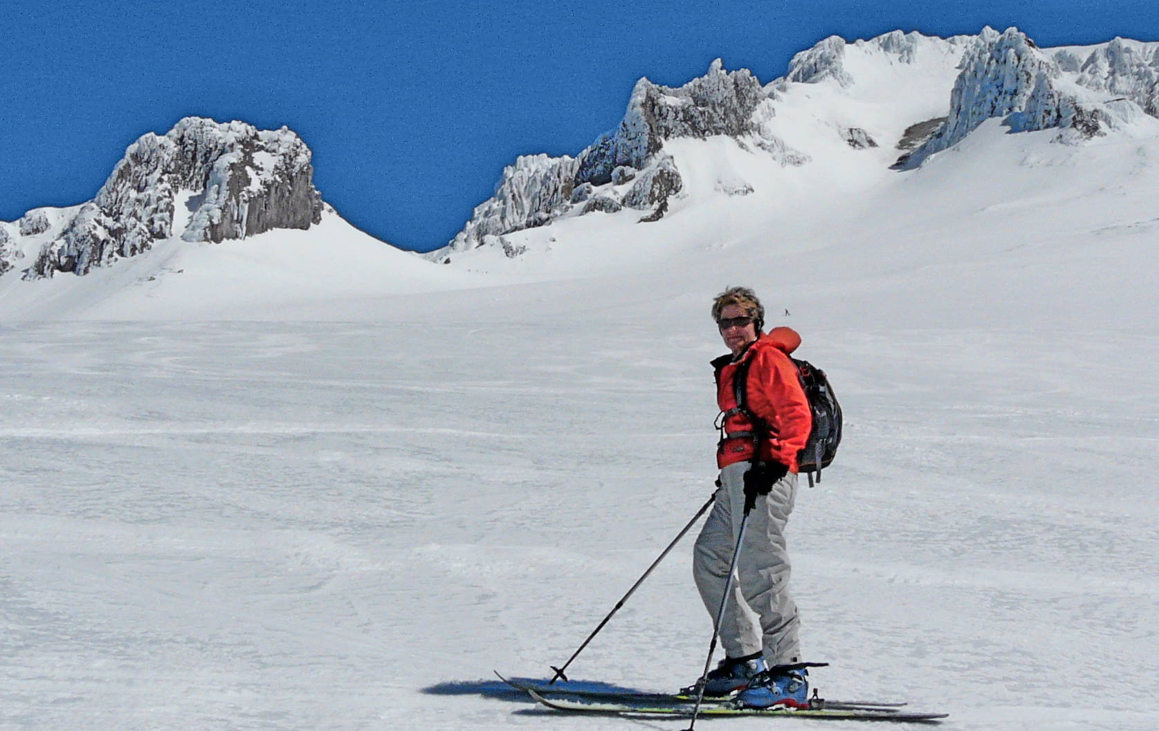 We awoke on the 14th in the Mt. Bachelor parking lot to fog, wind and drizzle – no way were we skiing even with a free pass. So we trundled down to Bend for a bike ride in the sun, and then headed for Timberline. When we arrived in the Timberline parking lot that evening it was cold and windy, but the skies were clearing. The mountain had a firm coating and the Palmer lift chairs were all in the stable. It was amazing that the snow pack looked about the same as when we skied here a month ago. We awoke Friday morning to bluebird skies and sunshine and no wind. The lifts started rolling at 9am and we skied the groomers on Stormin’ Norman until the Magic Mile quad terrain appeared to soften. The groomers along the Magic Mile were creamy. Any ungroomed terrain had a shiny/glassy look which we knew would soften. About 10:30 we tried the oven-warmed, off piste terrain and it was perfect – Jill and I cycled the untracked “firnspiegel” under the Magic Mile chair. The icy crystals just crinkled and sheared as we cut figure 8 turns. You could hear the crinkle of the surface behind you as you ripped down the slope. What a great feeling.