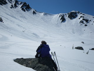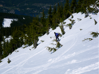 Tom K. and myself spent a few days camping on Alta Lake and skiing West Bowl in the sunshine. Both experiences were excellent. I had never skied the north side of West Bowl (Sneaky Pete); photos 2 and 3 are in the glades found on that side. Photo 1 shows the typical route into West Bowl from the south side. We were ambidextrous and used both sides of the bowl many times. The upper mountain is still in good condition, but Harmony was not made available. Even West Bowl was considered out-of-bounds and was to be skied at your own risk just like the Gem Bowls and Blackcomb Glacier had been on the other mountain. I will definitely get up there again this year.