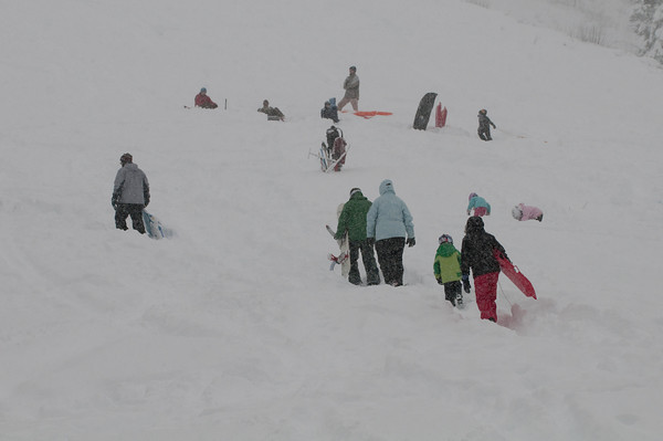 There were tons of people milling around the lodge area -- sledders, jibbers and gawkers. A few people were hiking up toward Big Chief bowl and getting some good turns. If Steven's gets another foot or two they should be good to open.