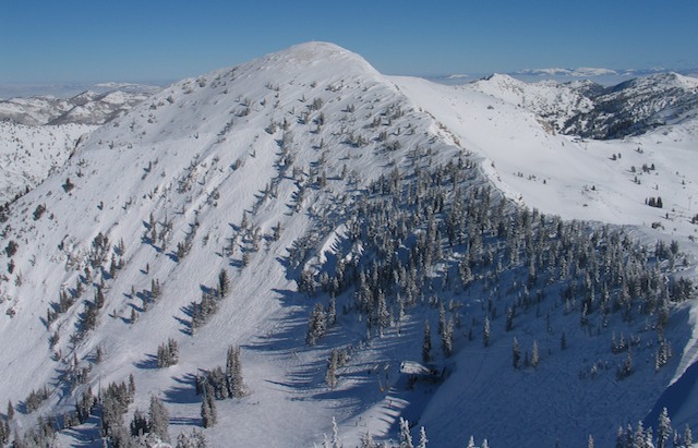 Picture 3: the High Baldy Traverse is on the left ridge, Mineral Basin is on the right. The tunnel to Mineral is barely visible close to the top of the Peruvian Express Chair below