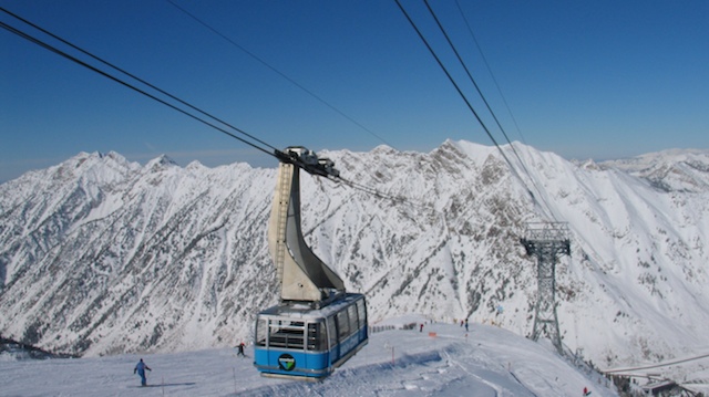 Picture 1: the tram at the Bird. The tram is something of a hassle and buying a tram ticket is not really necessary. There were skiers climbing the mountains shown on the other side of the valley despite the very high avi danger