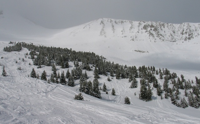 Picture 2: Lots of tree skiing off of the Shedhorn Chair. Skiers were working the chutes on Dirtbag Wall in the background
