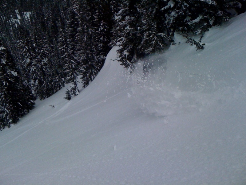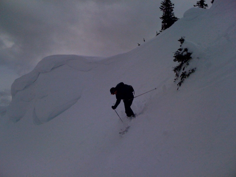 Then we traversed beyond Three Way Peak to Dog Leg and skinned three laps for untracked runs in 6-10" of fresh powder on the North fan. Other north aspects might be fine tomorrow in areas that were well covered by clouds today.