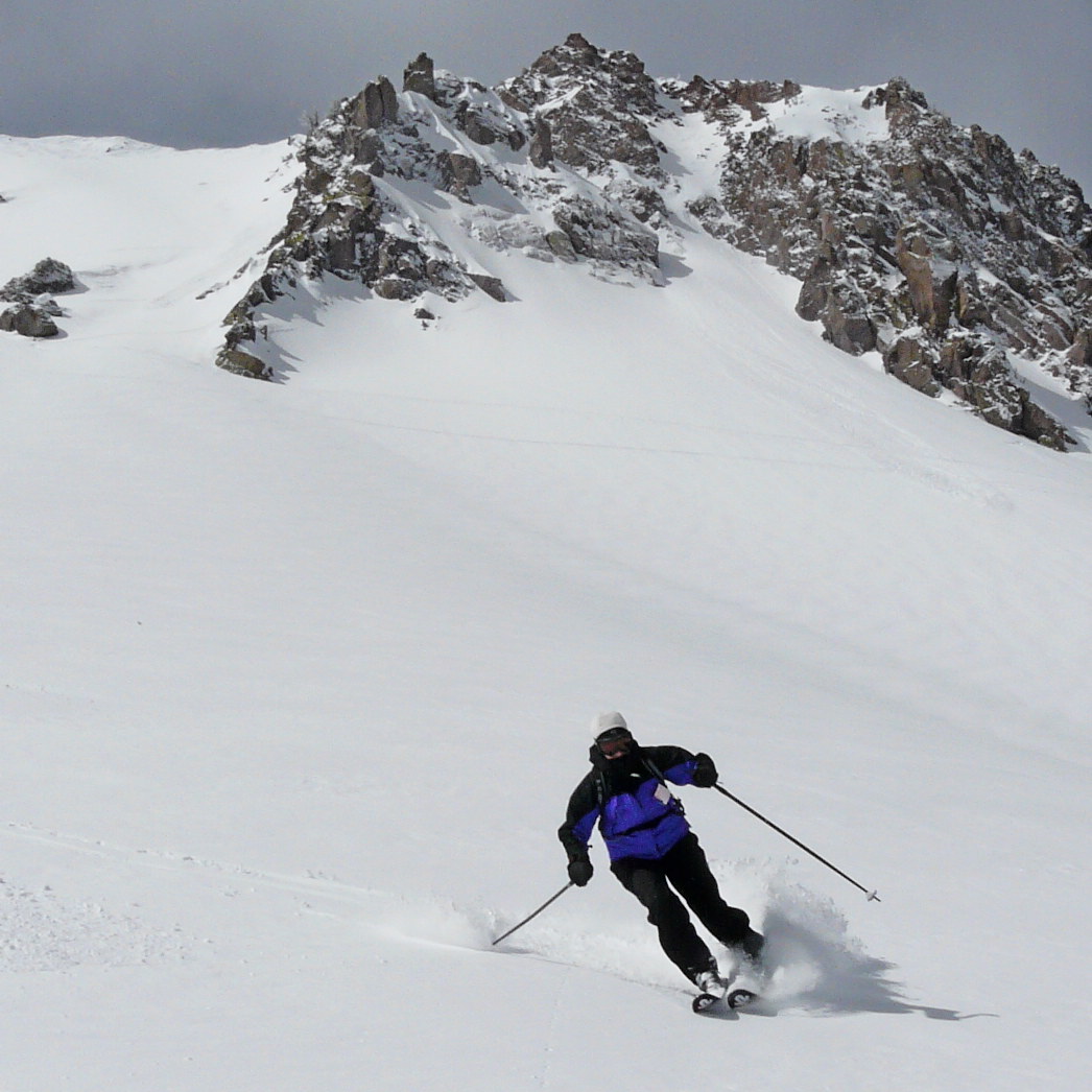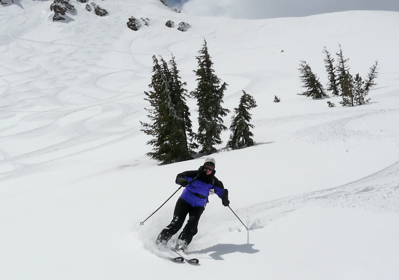 OK, the forecast for the 29th wasn’t encouraging, and Hillary and Dale had to return to Seattle. This morning Jill and I were up early and the sun was shining. There was a coating of fresh powder, and the Mammoth ski report was 5 degrees at the summit with 10mph winds and 12 degrees at the base with 12” overnight. Yahoo, another powder day. It’s just hard to believe that it’s April 29 and we are lift skiing with a foot of new powder. Jill bought our senior tickets for $34 each. They were running 4 express quads and the Lower and Upper Gondola. They started loading butts at 8:30, and the locals were out in force. Every powder hound was cycling the lower lifts waiting for the opening of the upper gondola. For 2 hours we watched the ski patrol ski cut chutes and spoon powder turns down the faces and bowls. Jill and I set in a traverse below Scotty’s and skied untracked powder lines for 2 hours. Finally, a non-patrol person was descending Climax from the upper gondola, and the rush for the upper gondola was on. We entered the long line at mid-station when I heard a local tell his buddies to get out of line and go to the base and board the gondola there. We followed suit and chased them to the base where we walked onto the gondola without a wait. There were Jill and I and 6 local boarders. The testosterone levels in the gondola were extreme. When we got off at the summit, I had to checkout Jill to see if she has developed facial hair on the ride up. You know the feeling of being at your favorite ski area and waiting for the patrol to allow loading of “the public”. Wow, it was great to experience that anticipation in late April versus mid winter after a storm. We skied untracked lines once we were off the upper traverse and lower catch lines for 4 hours. During those 4 hours, the sky went from sunshine for 3 hours to flat light for the last hour. The Minarets were visible and majestic early in the day. It was a glorious powder day, and the snow quality was exceptional. Boot deep powder was present in protected areas and gullies, while some ridges were wind hammered and had a firm frozen surface. You learned very quickly why certain lines were untracked. We were planning to drive north for the opener at Alpine Meadows on Friday (operates FR, SA, and SU only), but it started to snow again lightly at Mammoth and for $34 we may have to return and ski more fresh powder tomorrow.
