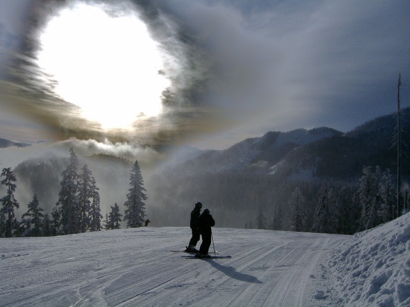 12/31/10 – A nice end of the year morning. Super cold for the PNW at 8F, broken overcast, no new but well groomed for 3rd chair on Silver Fir at 9. Fast cruising and a few first track turns in a handful of stashes were enjoyed. Hogwild/Silver Nug/Pigsty was pretty cut up but still fun-ish. Headed over to empty West for some zippy cruising under Easy Rider and to mark up some more firstie stashes, then Parachute off to the left wasn’t too shabby even though the middle groomed line was a train wreck. Called it done enough to bail as the crowds were starting to stack up by noon. TomK & Kerry.