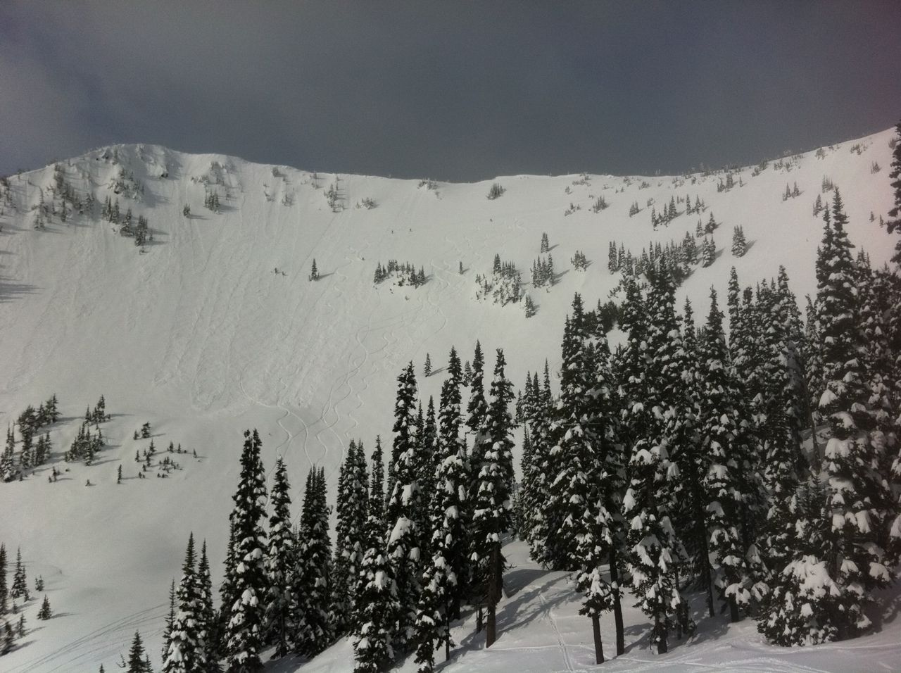 Blue skies, calm wind, and an inch of fresh snow greeted us at 9am. Chair 6 and the Throne opened at 940, after being closed for a few days! Powder Bowl skied great, but got heavy quickly with the sun. Everyone got several clean lines off the Throne and basin. By noon things were getting heavy and by 130pm the forecast 3-8" snow had begun. Raining at the base for an hour or so around 2PM, then snowing again.