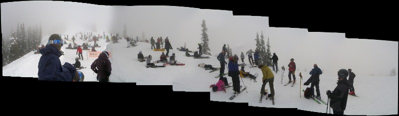Got there for the 0850 opening to see a low overcast & fog, rode up the gondy to the top fog, and started cycling Lucky shot & Chicken shot in the fog. After a couple of foggy runs, headed down to the base thru the fog where it was finally not foggy a third of the way down Skid Road just to join the big line at the Gondola that did move pretty fast. Headed up thru the fog again, waited for a “clearing” of the fog. Hung out in the fog with ski patrol and abut 300 folks at the end of Lucky Shot’s behind the ridge traverse while they did a ski cut in Powder Bowl to try and drop some of the thick new snow down thru the fog, then zipped thru the fog down to Rex where the fog was not quite as dense. Scored a Ferks run in not-fog, then the fog rolled back in, so a couple more Lucky runs and then down and out. Snow was sticky during that first bottom run, getting fairly sticky at Gandy’s towards the end due to the warmth. TomK