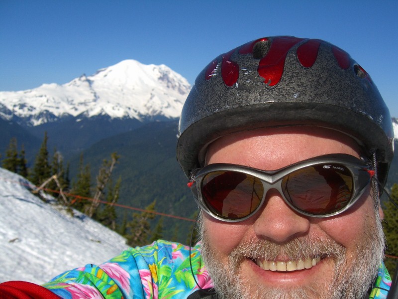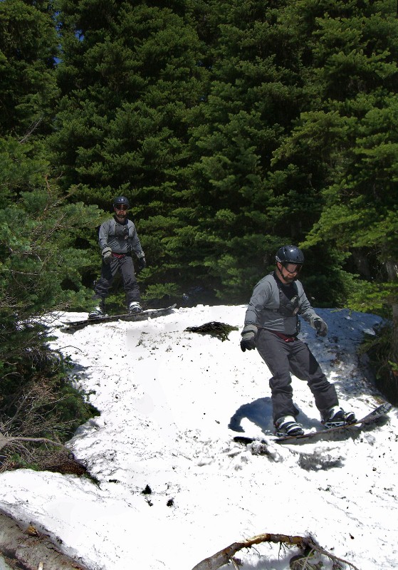 7/2/11 – Green Valley at Crystal is still in great shape. Sunny day, and snow was nice and soft even in the shadows, it just kept a nice creamy consistency all morning long. Started out with a run out Huckleberry to the ropeline and then down Ottobahn/Sheppard where the sun cups were very carveable. Then Iceferks with a drop down to the lift via the diagonal traverse across Bill and West faces. After that we just bopped here and there thru a few tree slots along Elk ridge and down Buck as well as a couple runs under the lift. . We even spotted a good-sized Marmot scurrying down Hucklberry/Snorting Elk bowl. Nice-sized crowd, the wait was getting to be 10-15 mins by noon. C lot was filled along the edge since there were lots of sightseers as well as sliders. Sunday’s looking a little dodgy with the cloud deck at 3-6.5 K and 30-40% showers chance, so we’re skipping that and will be back for Fourth of July. They’re officially also going to be open July 9/10, and a patroler unofficially fessed up that they are hoping to reach August since there’s even more snow up there now than in ‘99 when we were sliding 2 weeks after the 4th. So get up there! TomK & Chad