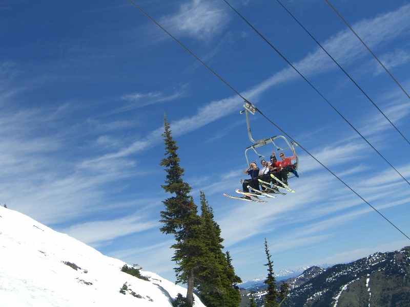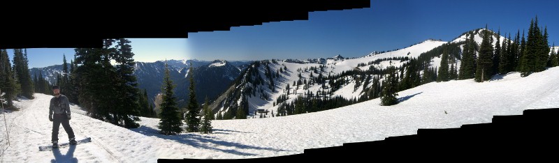 7/4/11 – 4th of July at Crystal was super sunny. A goodly number of bikinis were spotted along with lots or shorts and Hawaii shirts. Snow was suncupped more deeply than Saturday, so not quite as much fun, but still fun enough. Pretty big crowd up there – 15 minute lift line waits by 1000. Snow out in the trees is getting pretty dirty now. Saw MiguelMasLoco whiz past first thing. Hiked up to the top of Northway lift for the start of our first run down the north rope line, and then all over the Elk bowl runs and ridge tree slots. Was having fun up till the last moment after going between two trees near the bottom and ending up with one ski in a pit of doom that threw me forward superman style onto and re-dislocated my bum shoulder. Ouch – that hurt, even with a quick assist from Chad and reduction that popped it right back in. Self-evacated down to the chair and then up to the top where a cute patroller slinged me up and then arranged a snowmachine ride up to the gondy. Looks like I’m off the snow till next winter and another summer spent re-habbin’. TomK & Chad