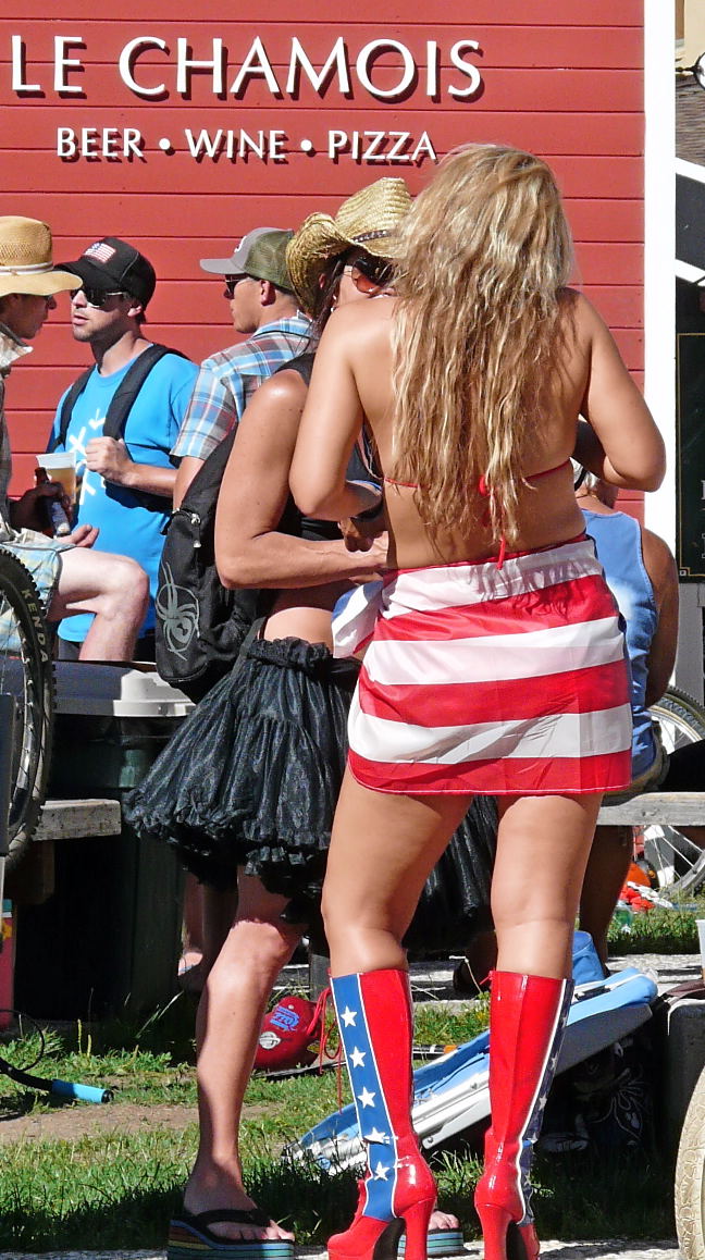 Early afternoon featured the Cushing Crossing which is similar to the Slush Cup with about 50 entrants competing in 4 categories: skis, snowboards, skinny skis (under 82mm underfoot) and costumes. A distinguished group of judges in varying degrees of sobriety, masters of ceremony, a leopard skinned judge offering bonus points, a salted snow path, a 50 degree water pond and thousands of spectators. We eventually worked our way to the finish line/patch on the completed side of the pond. The event took 2 plus hours and naturally became more enjoyable as the sun and hot temperatures encouraged alcoholic consumption by spectators and contestants. The new Squaw village was designed by the group that designed Whistler village so there are similarities. Early evening there was a concert then a fireworks display that was visible from our campervan.