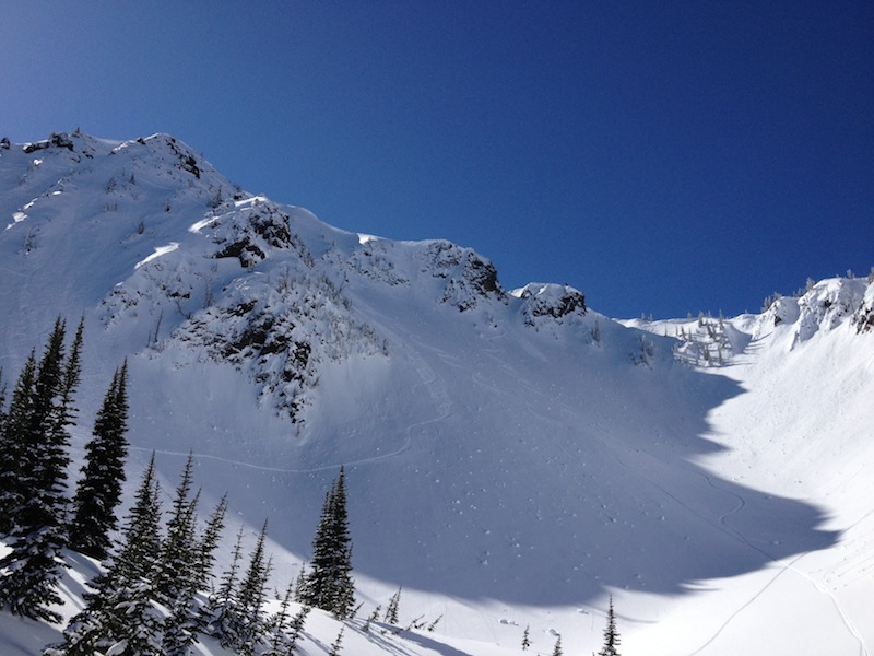Conditions: sun, sun, sun and no wind. Southern aspects were softening by afternoon. Sheltered southern aspects had icy suncrust and chunder. Shaded northern aspects (King/Throne) had ~ 6" - 10" loose sugar with scattered but avoidable big sugar cubes and chunks. I easily triggered a few medium sized loose dry sluffs. Groomers were smooth and fast for the run out.