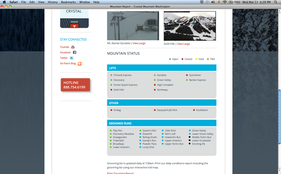 Especially when you consider that Crystal advertises that their lifts run at night! Here is a 6:28 PM screen capture of Crystal's lift status. This tells me that 5 lifts are running on the hill. Clearly, there is a problem.