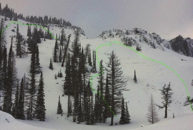 Pretty impressive. The natural slide Jtack shared here is just beyond the photo to the right. Even though we were in bounds, most of my group was skiing with transceivers and I wore my float pack and carried shovel and probe. Snow right now; I love it, but I don't trust it.