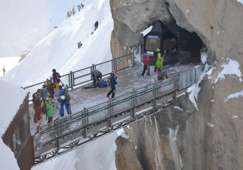 Took the two wild trams to around 12,000 feet on a ridge of Mount Blanc. Would be similar if there was a tram from Paradise to Camp Muir, and another to the top of Gibraltar Rock. Did not do the ski as there had been a couple of feet of new snow in the alpine after 3 weeks of drought. Could have been great or disastrous. During my previous 8 days of skiing, I had observed numerous large wet slabs that had gone to the ground. The two pictures show the tram building bridge that connects to the cave where you can ski from, and the arete walk itself. It's much talked about how scary the start of the hike is, but to me the descent looked very well equipped and quite safe. Definitely mountaineering exposure, however. If you put a rope and crampons on a nervous person like the guides did, I'm sure they'd be fine.