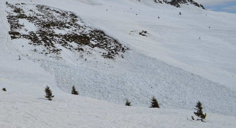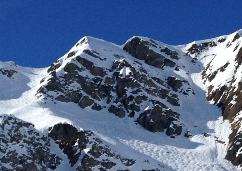 Le Plagne is a beautiful and vast area with a very stunning and spectacular alpine. My second picture shows the theme of the week! These slabs were all over the alpine from 25 degrees to 50 degrees. They all seemed to find the ground...There had been no new snow for weeks, and the sun was all day long with the daytime highs above freezing.