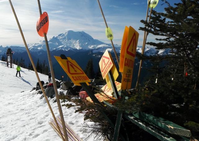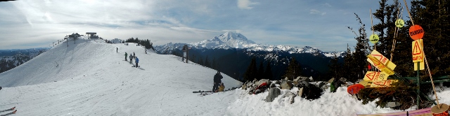 Around 2, the snow started setting up. We had 31 runs in GV, but that left us a couple runs short of the CD Minimum ™ vert. Oh well, off to download. Segue: During the day, we talked to a laid-off liftie who told us he had poached Lucky Shot yesterday and skied all the way to the bottom. He explained his route to us. So, as we're just starting to hike to the gondie, a group of long-time Crystal skiers were ducking the rope to the backside trail to Lucky Shot right in front of ski patrol. We watched and they didn't do anything, nor did they radio anyone. So, without a moments hesitation, we jumped in with the group and headed down Lucky. It skied great until we got closer to the chair. Again, I have no idea how they are going to open that tomorrow. Past the bottom of FQ and down to Tinker Bell. From there on, really sketchy. Had to ski across straw in a couple of places, but actually made it all the way to the bottom with minimal ski damage. There's no way it will last another day of sun. At the bottom, they were starting to cycle Chinook, so I suspect they will be uploading/downloading using Chinook as well tomorrow. With the extra vert from skiing down, we achieved the CD Minimum ™.