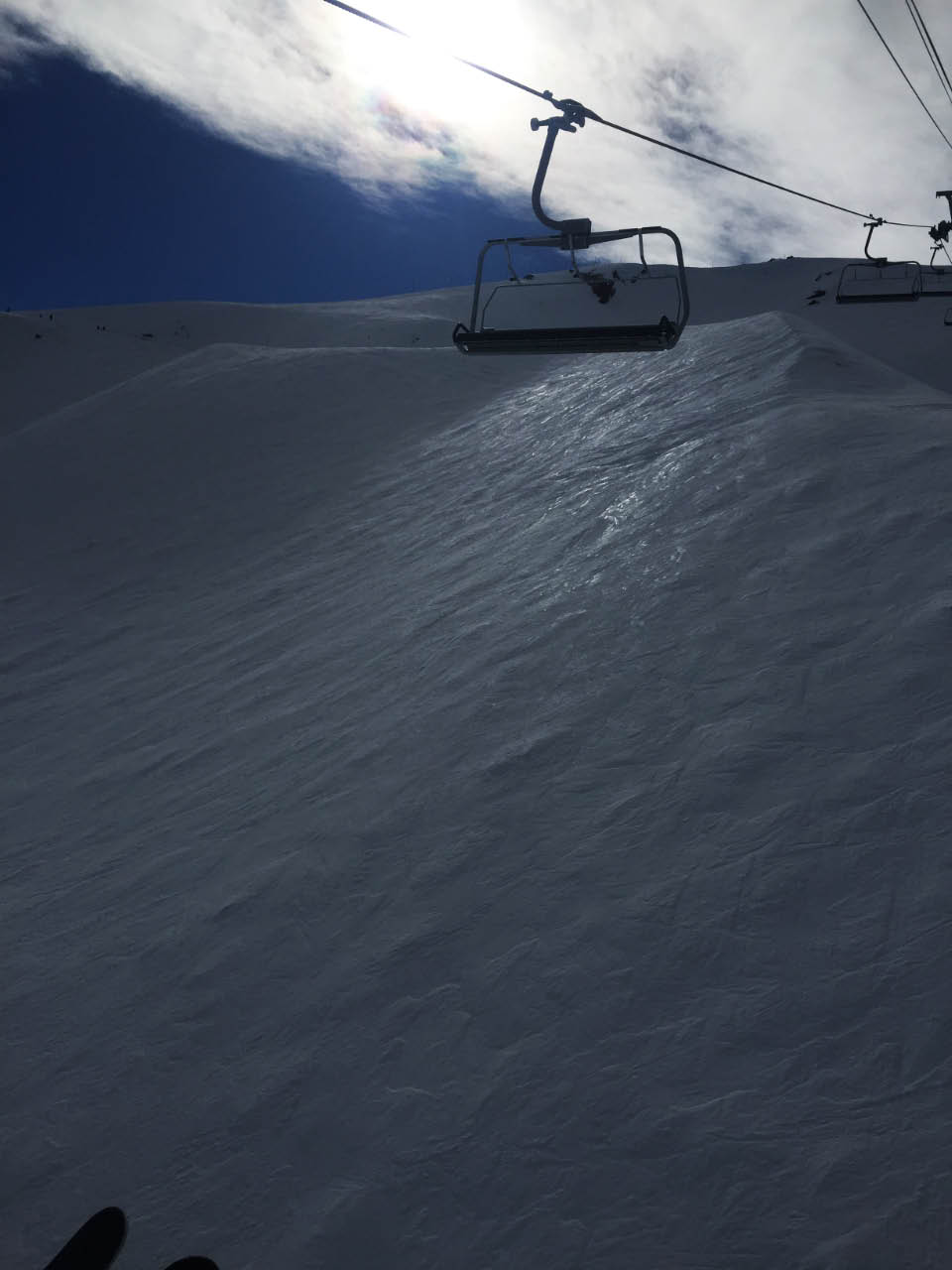 Not much sun this morning and cooler temps so I knew it would be firm up top. By Noon it was mostly clear so I made the most of it and toured the hard Alpine via groomed trails only. Going up Peak Chair I saw one guy off piste. Symphony was hard as a rock as was Harmony so - I ate lunch and went downhill to search for soft bumps. Not a bad run to the Valley. Made my way up and down Solar Coaster a few times but it was still not softening even though the sun was full out. Only the bottom was soft - way soft. Because I was by myself and started way late, I kept at it and caught the last Glacier Chair and had a partly OK run down Crystal Ridge/ Ridge Runner and the soft Valley bottom. I tried hopping into Heavenly Basin but the intense noise and shaking drove me back to the traverse. Rode up the Gondola and closed Seppo's again and got fresh Cat tracks again. Rocks starting to pop up on Lower Dave Murray. I hope it gets cold so they can make some more snow. I also hope something drastic happens with the weather. This bullet proof stuff will not change unless it gets real warm again or it gets completely covered up by a big one. Even though I've got a pass - I'll probably cut this week short unless things change. 26,000 Vert.