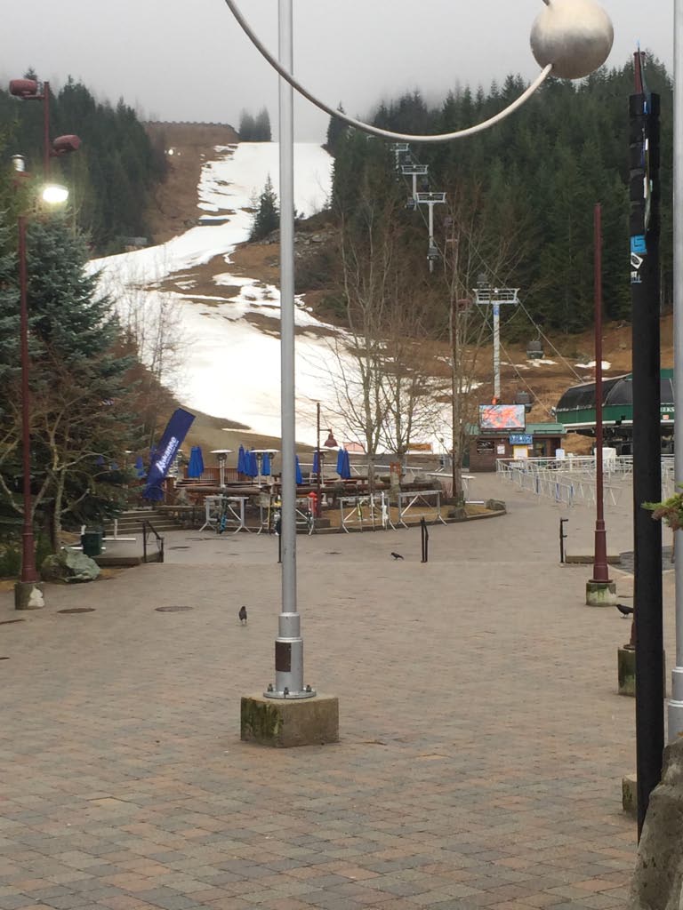 Tough day on the mountain today with fog and rain on the bottom, and off and on visibility at the top. The much anticipated snow hasn't accumulated into anything more than half an inch yet. Snow quality was good enough for the limited speeds the visibility let you go. Creekside pictured below. When you live for skiing powder, trees, steeps, and bumps it's hard to be very enthusiastic about a day like today. For a skier who likes soft snow and groomers - you could have had a ball today at mid mountain with all lifts running except a few worthless ones. I never say this, but Blackcomb did seem to be more cloud free every time I looked over there. Praying for snow.
