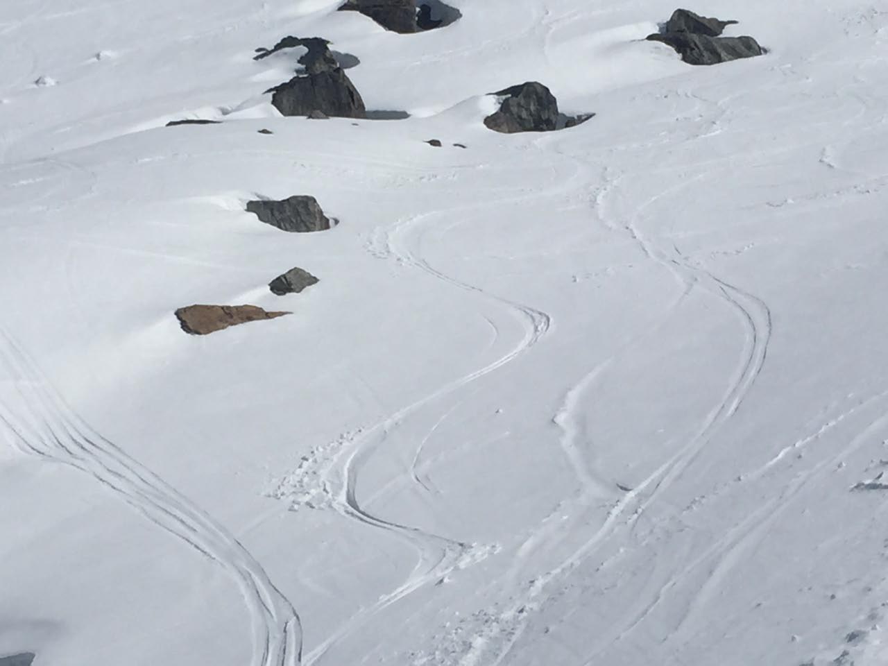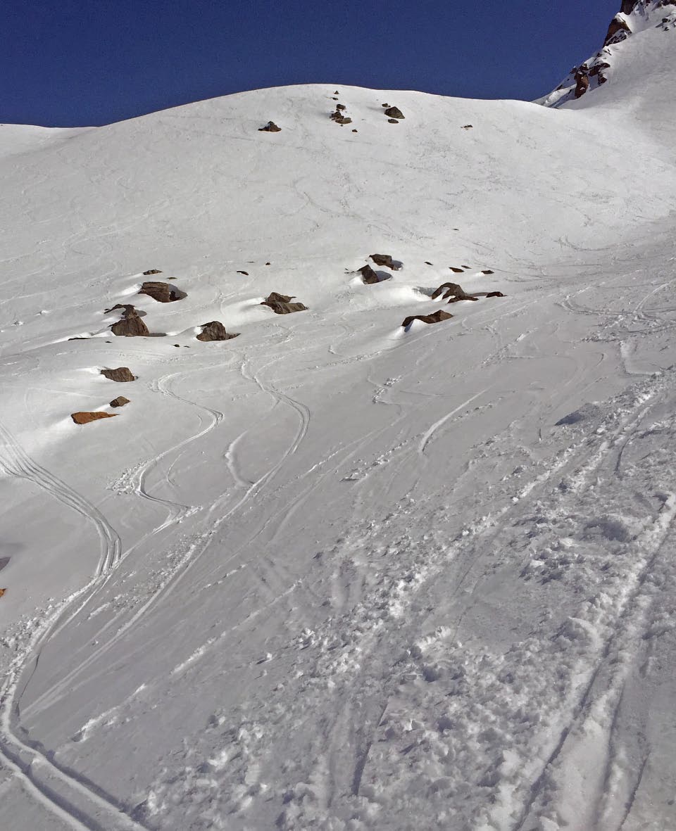 Don't know if it's going to last long....... but it was creamy, buttery snow all day. You have to watch the sun and elevation and move around, but it was good stuff all day. No stickiness or slush or morning ice for us today. Whistler Bowl stayed firm but still good, Cockolorum area was fine as well late in the day after everything else got soft. Pictured below are late afternoon tracks below West Cirque. Nobody is here! That new snow was from a few days ago... The Frog Hollow exit is still great.