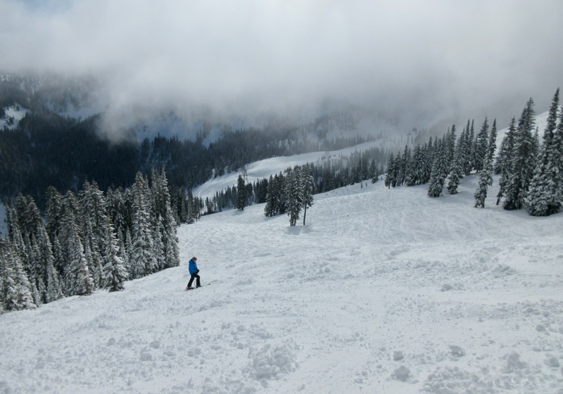 We got there early expecting another cluster like we had last Tuesday, but NO, I guess 6 inches of snow is not enough to bring all the powder pigs out. We have very modest lines all day. Most of the time it was just walk up and get on. Intermittent sun, with only a bit of white out on the front side. The backside had excellent visibility. There was bottomless powder to be had in selected areas. A lot of times you would bottom out on the firm layer underneath, but once you got used to that everything skied well. We skied a lot of stuff all over the mountain. It was definitely a non-groomer day. Is one of those days where we adventured out to some of our favorite spots that haven't been skiable much this season. Things started to get scrappy towards the end of the day.