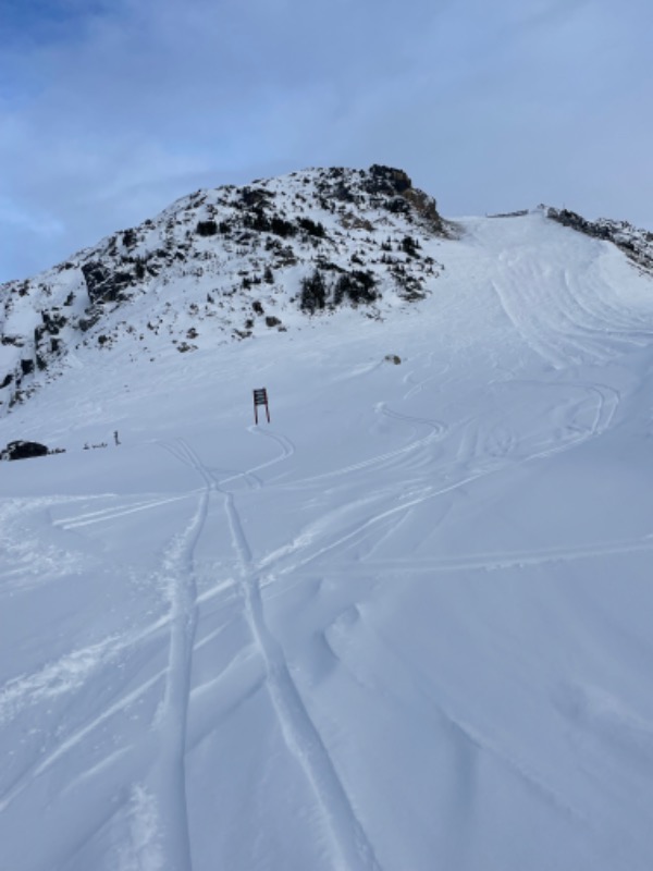 Not open, but they are allowing hiking, and luckily for me, they happened to groom Frontier Pass and Hiway 86 late in the day, and right before I got there to enjoy some sunshine. There was also sunshine first thing in the morning, making Harmony Ridge and even Burnt Stew loads of good turning fun. I hiked up into Boundry Bowl to sample some really nice looking powder - that wasn’t. Doing