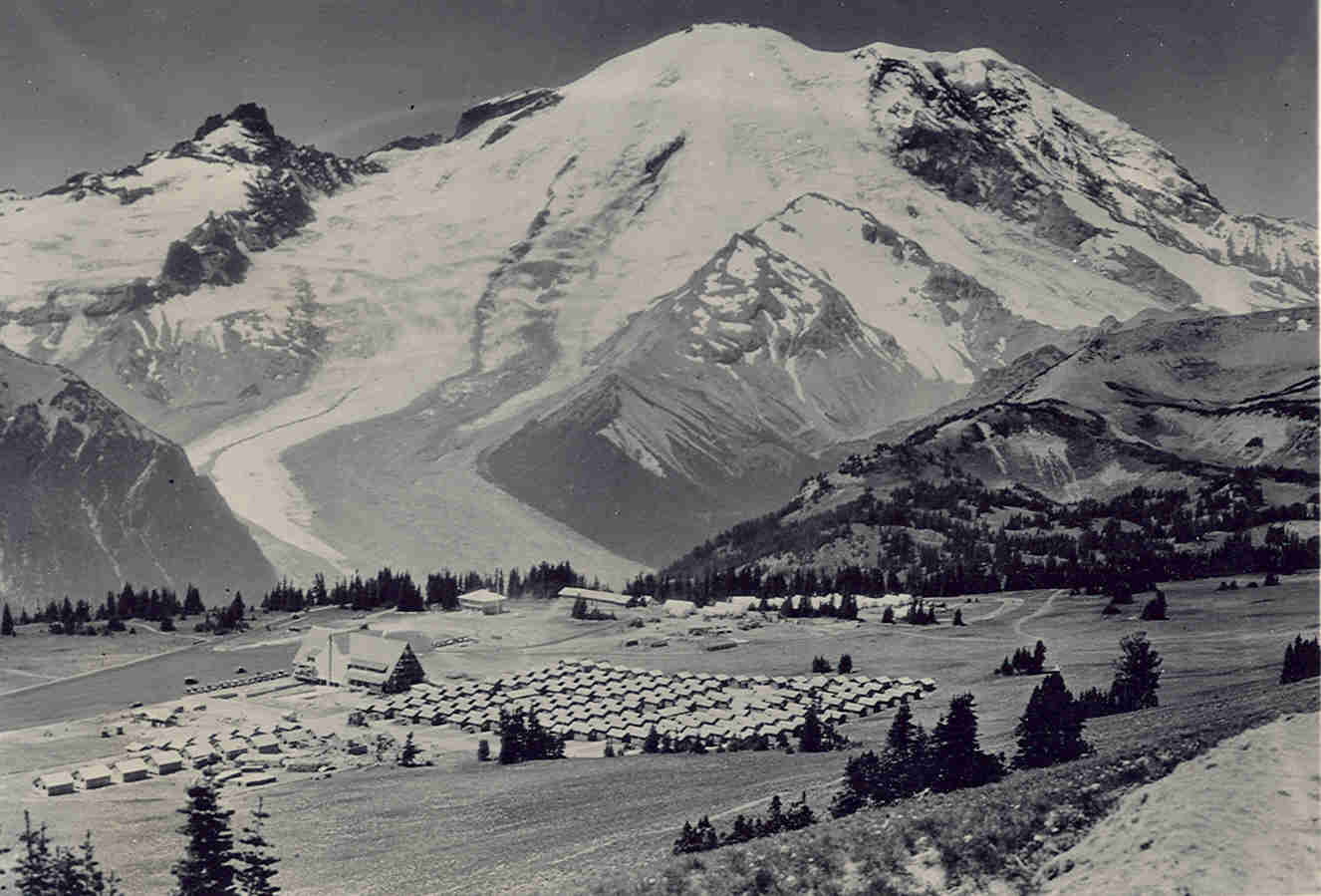 Should be the 1930s. The Sunrise hotel and access road opened in 1931. In "Wonderland: An Administrative History of Mt Rainier National Park" the author writes that hundreds of "housekeeping cabins" were built at Paradise and Sunrise for use by summer tourists during the Depression (p. 292).