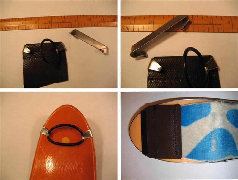 Milling brush grabbing slots in my skis did not appeal to me, and not wanting to order things I did not understand, last year I started playing around with different ideas for tip bales. The last picture shows my current solution. Except for a static load test, it's completely untested on the snow. Hey, is that any different than a lot of the new gear offered each year?