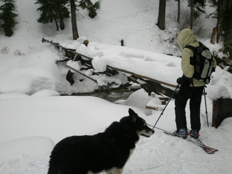 Sunday Dec. 10: We planned to take a peek up Newton via the Elk Meadows trail from the Nordic Center parking lot, but alas, the bridge across Clark has a tree in the middle of it. We were tempted to cross on a small snow covered couple of logs. We discussed the implications of falling in, especially falling in on the way back if got dark, or if the dog fell in. We decided it wasn't probably worth it. So we skinned up Heather Canyon ski track and were amazed at the new course the river has taken. Sadly the big wall on the east side near the bottom of the Heather lift is now washed seriously washed away, probably hampering those turns in a big way. :-[ It snowed then turned to rain but the snow was turnable in the afternoon.