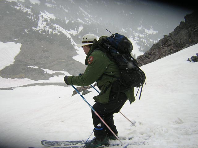 Sunrise 2nd burroughs conditions. Ranger Casey doing a snow saftey analsis for us! He's my kind of Ranger and damn good skier to teleboot! Somebody needs to get in there and get some shot of skiing between those twin spires. Have fun tomorrow !