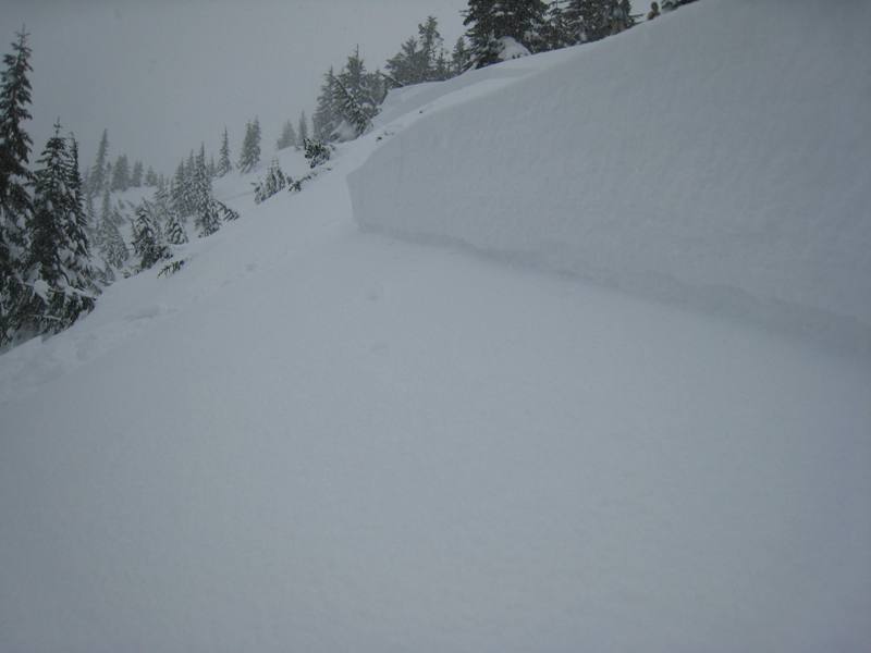 This happened years ago in the Southback at Crystal, We got there as chair 6 closed due to winds, we beat the patrol to the gate. I was with two other guys, one guy was insistent that he ski the bowl, even after seeing the separation. It took several minutes to talk him out of skiing that bowl. Like a lab looking for a tennis ball, he just could not let it go! And we backtracked all all the way out of the South basin, up the King, at times literally on our hands and knees, the winds were belching to over 50. We skied down a wind affected ridge in trees to safety.