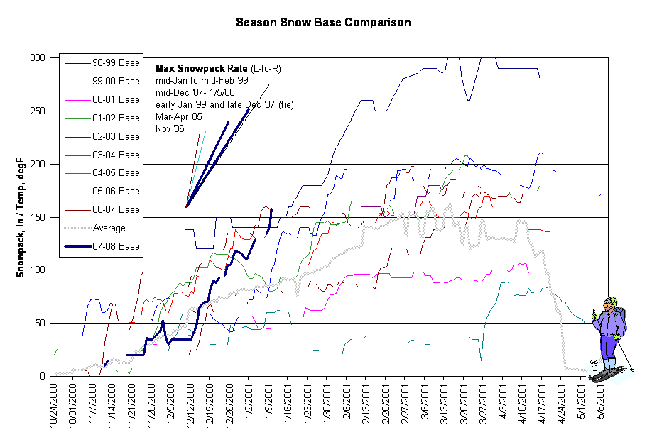 So, I don't have detailed or official snowfall data, but my unofficial Mt Baker snowpack data is showing a record-setting pace. 123" of new base (35 to 158") in the past 30 days vs. 120" (140 to 260") for the 30 days beginning 1/12/99 (see chart). If the snowlevel stays low enough for the precip to keep falling as snow, that record pace could really be shattered. Scary snowpack profile though -- 2ft of heavy, dense windblown on top of all that nice dry powder (that I didn't get a chance to enjoy :'()....