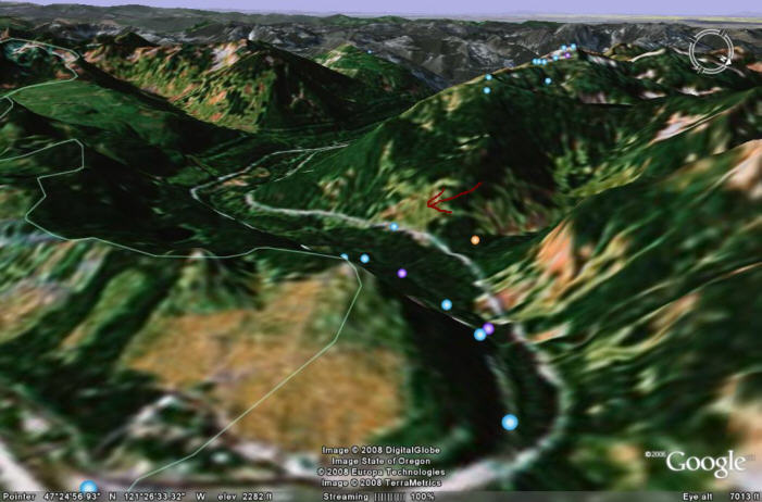 Below is a google earth image looking southwest over Snoqualmie Pass, which shows the general location of the slide path (brown arrow) where the 2 cars were caught earlier today. This slide path is on the eastern side of Granite Mountain and near the southern end of the causeway over Denny Creek. Sounded like it may have been fairly deep slide from the State Transporation Secretary's description in a newscast that rocks were present in the slide debris.I was wondering if anyone had any pictures from past trips or a quick google earth image that would illustrate some of the more suspect slide paths that effect I-90.