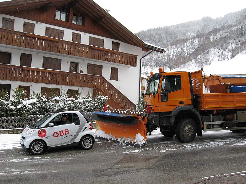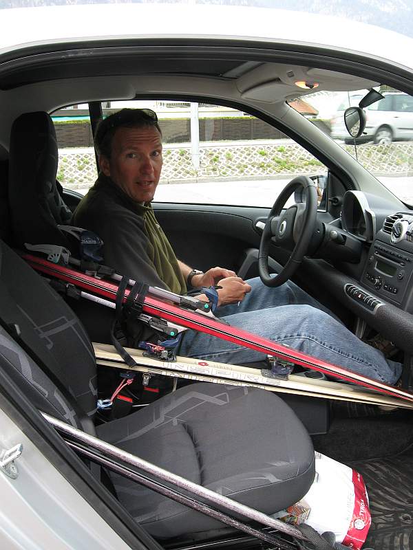 We have rented a Smart car at the Innsbruck railway station, only 18 euro per day (100 free km) and only allowed to drive in Austria or Sudtirol (formerly Austria for 500 years until 1918) It has proven to be a great way to get to places busses do not go, which are few. Plenty of options to ski within 50-100km of Innsbruck so the mileage limit is not a big problem. Be careful with snowplows, they can scrape you off the road, or the snowmiller at Snoqualmie that chewed up a Toyota in February 2008.